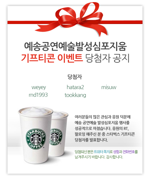 여러분들의 많은 관심과 응원 덕분에 예송 공연예술 발송심포지움 행사를 성공적으로 마쳤습니다. 응원의 RT, 팔로잉 주신 분 중 스타벅스 기프티콘 당첨자를 발표합니다.